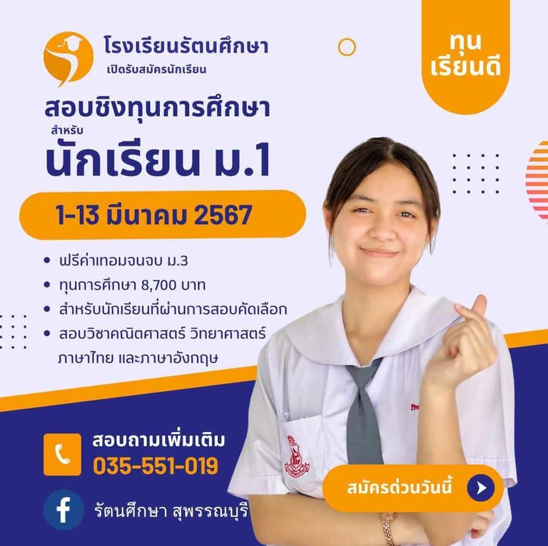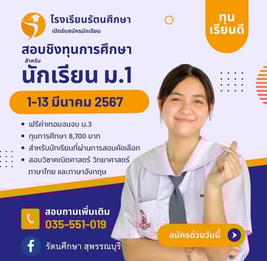 เปิดรับสมัครวันนี้ - 13 มีนาคม 2567 สอบถามเพิ่มเติมโทร 035-551019 หรือ Inbox @รัตนศึกษา สุพรรณบุรี